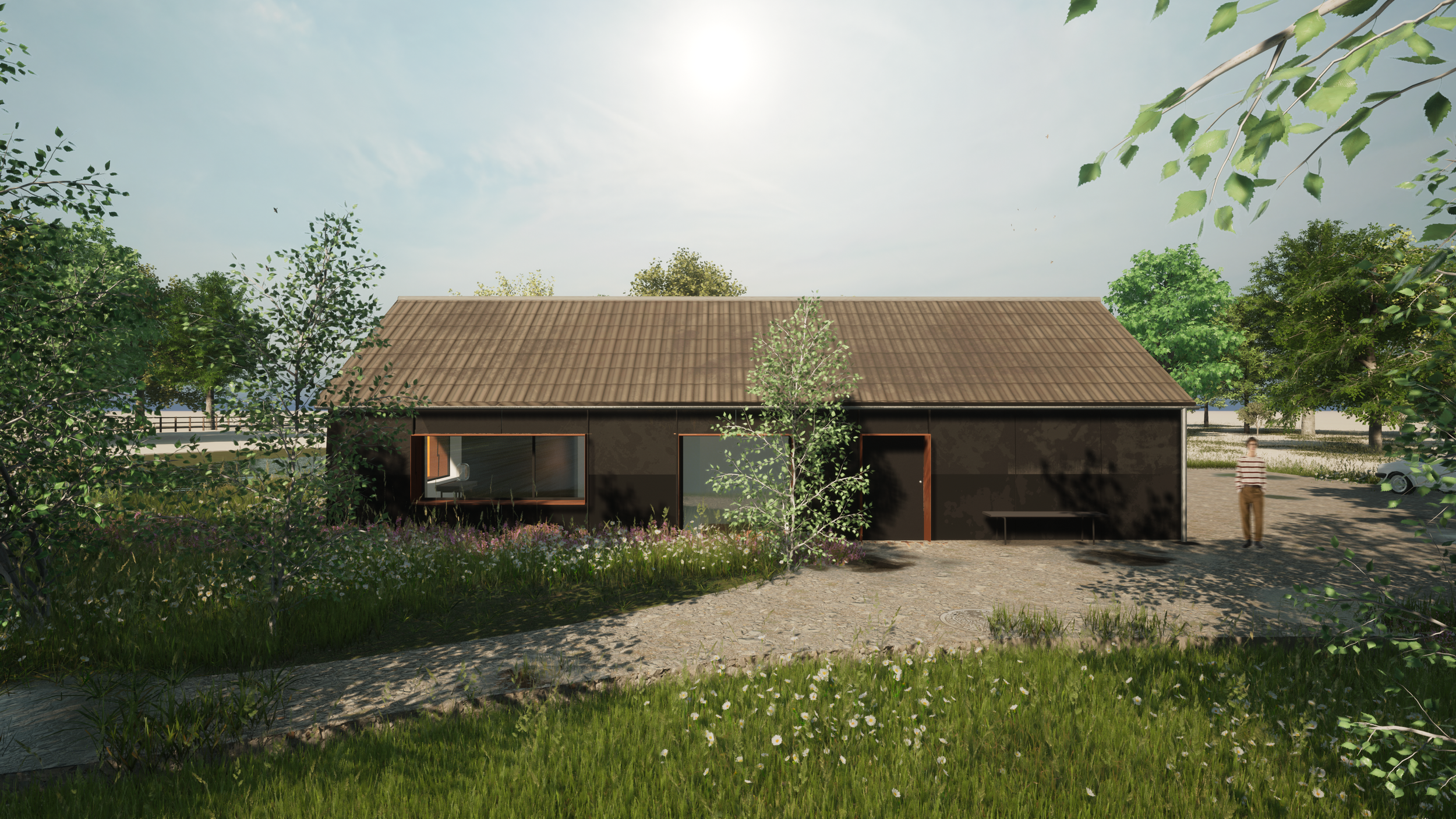 We proposed recladding the cottage in large-format black Viroc boards, allowing the building to recess visually into the woodland edge. With improved insulation and carefully refined window openings, the house will feel quieter, softer, and more in tune with its surroundings — particularly when viewed from the historic green lane to the north.